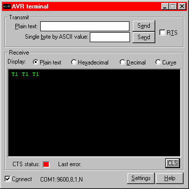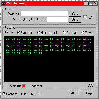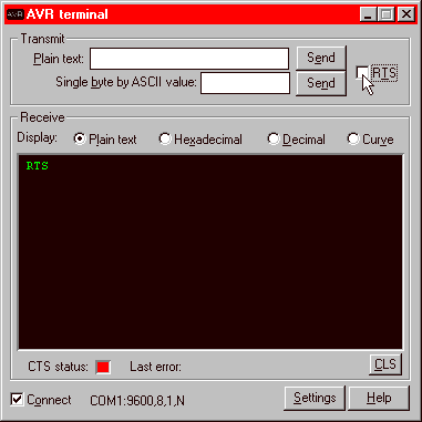 1. Markieren Sie einmal die Checkbox "RTS" und entfernen die Checkmarke wieder. Beim Entfernen der Checkmarke (und nur dann) muß der AVR den Text "RTS" senden (und das nur einmal). Wiederholen sie das mehrfach. |
