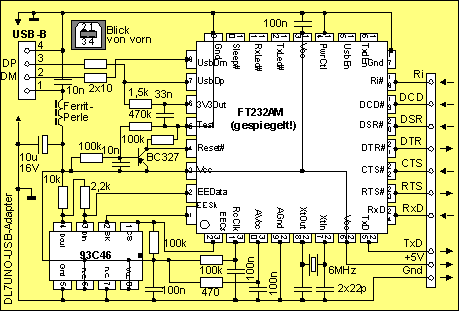 Und hier ist der selbe Schaltplan noch einmal, aber diesmal mit gespiegeltem USB-Controller. Das soll eigene Platinenentwürfe erleichtern, wenn wie bei mir der IC auf die Kupferseite (also gespiegelt) gelötet wird. Die gespiegelte Schaltplan-Variante vermeidet, daß man sich in Gedanken ständig den Kopf verrenkt ;-) |