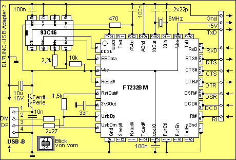 Das ist der Schaltplan der Variante 2 mit dem USB-Controller FT232BM. Der FT232BM ist die zweite Generation des FT232AM und benötigt nicht nur weniger externe Bauelemente, sondern wurde auch in der Funktionalität erweitert. Außerdem ist das Datasheet des FT232BM erheblich besser, umfangreicher und liefert mehr Hintergrundinformationen. Bitte vorm Aufbau das Datasheet lesen, insbesondere, was die Anforderungen an den EEPROM anbelangt. |