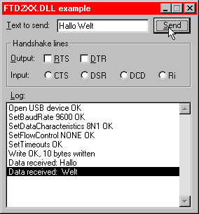 Screen-Snapshot meines Beispielprogramms für den Direkt-Treiber (direkt: es wird nicht mit virtueller serieller Schnittstelle gearbeitet). Es ist ein AVR angeschlossen, dessen Programm lediglich Zeichen über die UART empfängt und wieder als Echo zurückgibt (Echo). Achtung: Bei der Verbindung zum AVR muß RxD und TxD gekreuzt werden. Alternativ kann man den Test auch nur mit dem USB-Controller durchführen, also ohne AVR. In diesem Fall verbindet man einfach die USB-Controller-Anschlüsse RxD und TxD miteinander. Die Funktion der Handshake-Leitungen kann man analog testen. Download siehe unten. |